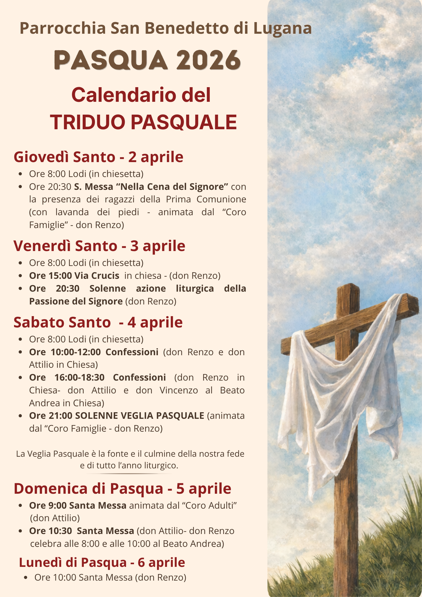 Articoli Quaresima Calendario TRIDUO PASQUALE di Maria Teresa Garagnani|Pubblicato 26 Febbraio 2026 Condividi: Condividi su Facebook (Si apre in una nuova finestra) Facebook Condividi su X (Si apre in una nuova finestra) X Condividi su WhatsApp (Si apre in una nuova finestra) WhatsApp Invia un link a un amico via e-mail (Si apre in una nuova finestra) E-mail Stampa (Si apre in una nuova finestra) Stampa