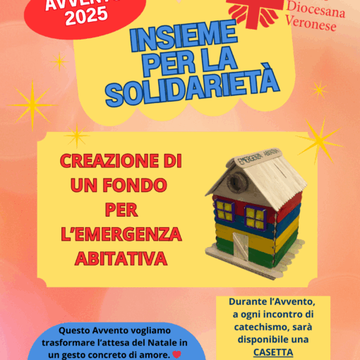 1 Dicembre 2025 – 25 Dicembre 2025 @ 8:00 – SOLIDARIETA’ AVVENTO 2025 Durante tutto il periodo d’Avvento, faremo una raccolta che sarà devoluta per la CREAZIONE DI UN FONDO PER L’EMERGENZA ABITATIVA, promosso dalla Chiesa di Verona per mezzo della CARITAS, info al link https://www.caritas.vr.it/caritas-crea-un-fondo-per-lemergenza-abitativa/ L’obiettivo è quello di aiutare le tante categorie di persone che hanno bisogno di una casa dignitosa e sicura […]