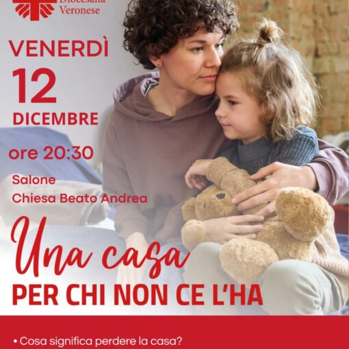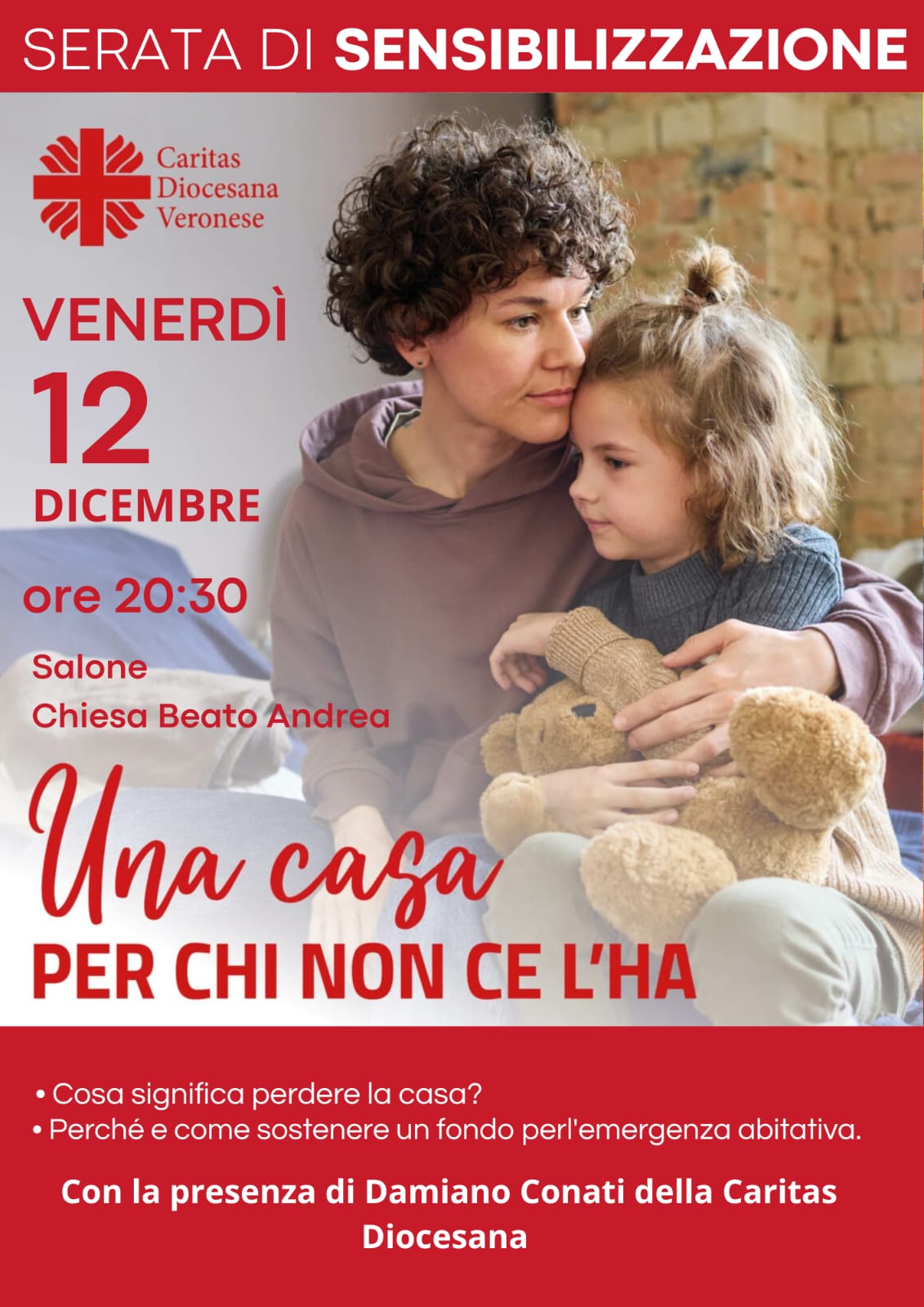 12 Dicembre 2025 @ 20:30 – 22:00 – Venerdì 12 dicembre 2025 ore 20:30 nel Salone del Beato Andrea Serata di sensibilizzazione sul Tema: “Una casa per chi non ce l’ha”, con la presenza di Damiano Conati della Caritas Diocesana di Verona