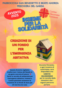 Durante tutto il periodo d’Avvento, faremo una raccolta che sarà devoluta per la CREAZIONE DI UN FONDO PER L’EMERGENZA ABITATIVA, promosso dalla Chiesa di Verona per mezzo della CARITAS, info al link https://www.caritas.vr.it/caritas-crea-un-fondo-per-lemergenza-abitativa/