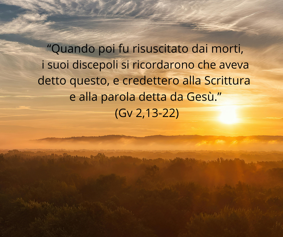 I suoi discepoli si ricordarono che sta scritto: «Lo zelo per la tua casa mi divorerà». Allora i Giudei presero la parola e gli dissero: «Quale segno ci mostri per fare queste cose?». Rispose loro Gesù: «Distruggete questo tempio e in tre giorni lo farò risorgere». Gli dissero allora i Giudei: « in quarantasei anni e tu in tre giorni lo farai risorgere?». Ma egli parlava del Questo tempio è stato costruito tempio del suo corpo. Quando poi fu risuscitato dai morti, i suoi discepoli si ricordarono che aveva detto questo, e credettero alla Scrittura e alla parola detta da Gesù.
