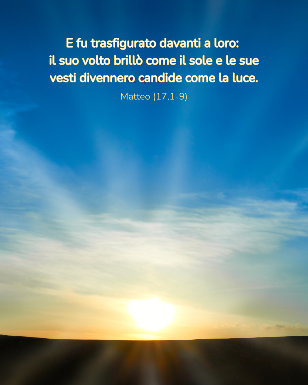 In quel tempo, Gesù prese con sé Pietro, Giacomo e Giovanni suo fratello e li condusse in disparte, su un alto monte. E fu trasfigurato davanti a loro: il suo volto brillò come il sole e le sue vesti divennero candide come la luce. Ed ecco apparvero loro Mosè ed Elia, che conversavano con lui. Prendendo la parola, Pietro disse a Gesù: «Signore, è bello per noi essere qui! Se vuoi, farò qui tre capanne, una per te, una per Mosè e una per Elia». Egli stava ancora parlando, quando una nube luminosa li coprì con la sua ombra. Ed ecco una voce dalla nube che diceva: «Questi è il Figlio mio, l’amato: in lui ho posto il mio compiacimento. Ascoltatelo». All’udire ciò, i discepoli caddero con la faccia a terra e furono presi da grande timore. Ma Gesù si avvicinò, li toccò e disse: «Alzatevi e non temete». Alzando gli occhi non videro nessuno, se non Gesù solo. Mentre scendevano dal monte, Gesù ordinò loro: «Non parlate a nessuno di questa visione, prima che il Figlio dell’uomo non sia risorto dai morti».